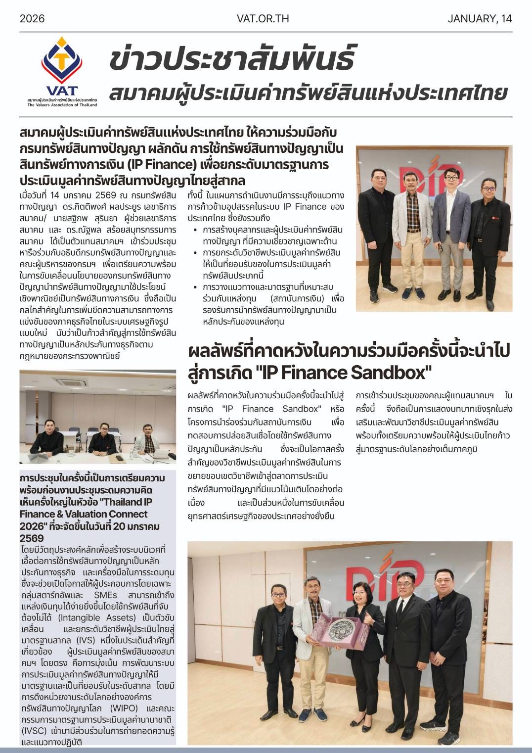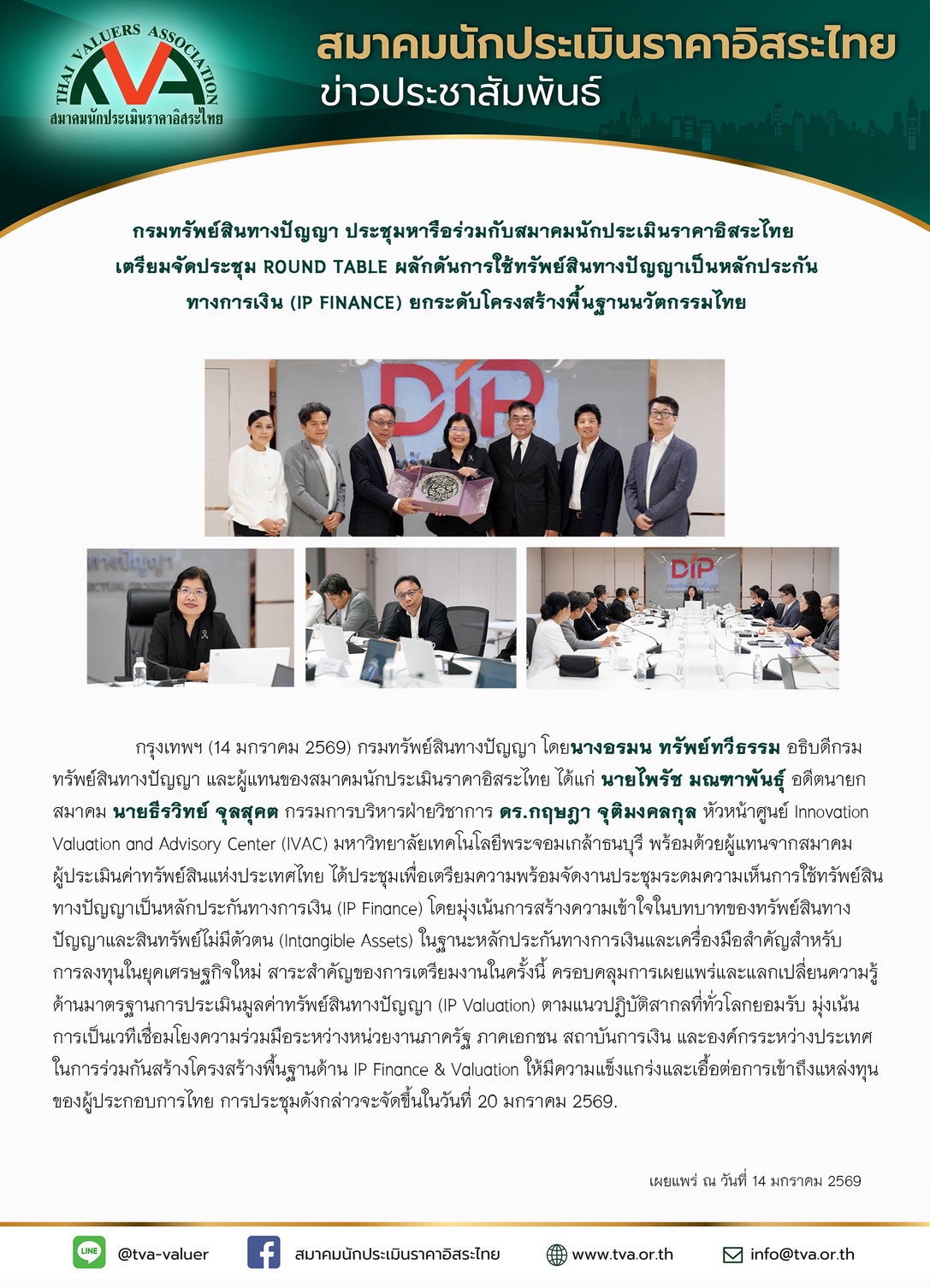 ประชุมวันที่ 14 มกราคม 2569 ณ กรมทรัพย์สินทางปัญญา https://www.ipthailand.go.th/th/ภาพกิจกรรม/item/อธิบดีกรมทรัพย์สินทางปัญญาประชุมหารือร่วมกับเลขาธิการสมาคมผู้ประเมินค่าทรัพย์สินแห่งประเทศไทย-ดร-กิตติพงศ์-ผลประยูร-และสมาคมนักประเมินราคาอิสระไทย.html